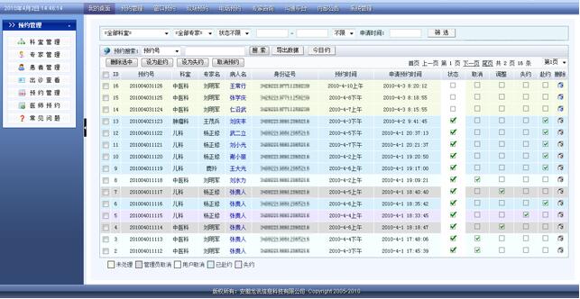 3、 預約確認后,生成預約號,就診時,需憑預約號領取門診號就診。 后臺管理功能描述 1、 修改、取消患者預約信息。 2、 領取門診號后,需銷號。(建議在門診系統的操作界面中套嵌銷號界面,且留有數據接口) 3、 統計、查詢功能:可根據管理的需要,隨意進行各類定制的統計和查詢。